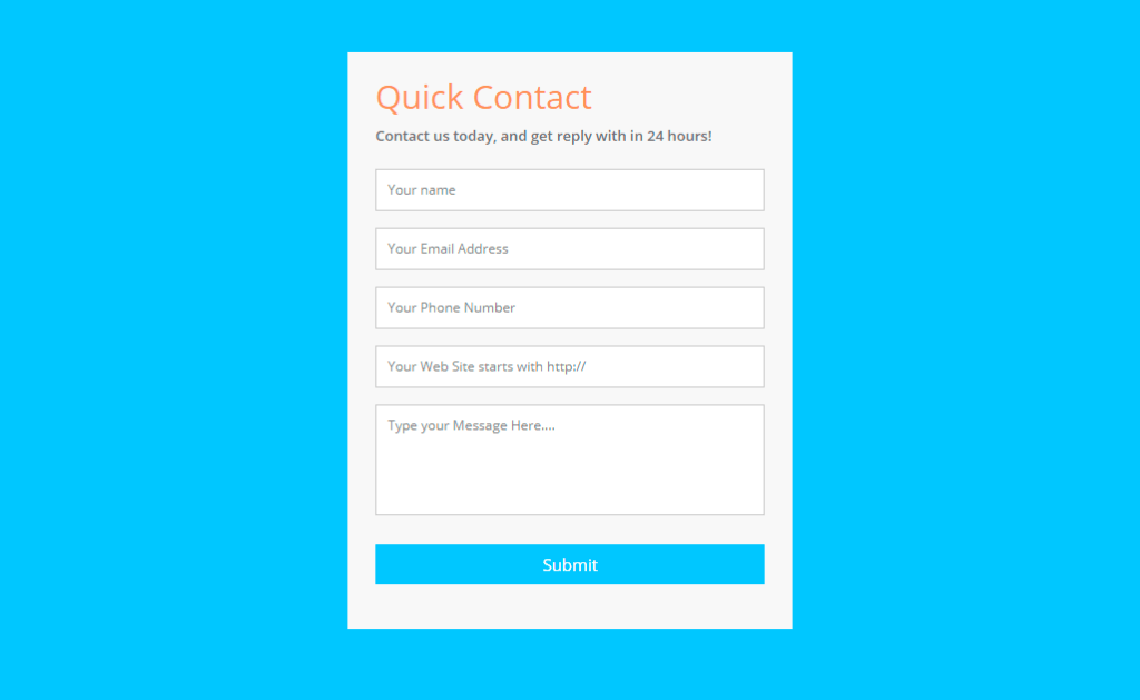 Ahora echemos un vistazo a un formulario de Bootstrap, esta vez proveniente de Shuvo Habib. Realmente no hay mucho que decir acerca de este formulario, aparte de que es un formulario de ancho completo que recogerá la información básica requerida de tus visitantes y la publicará en tu dirección de correo electrónico de la manera que desees recibirla.