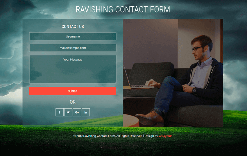 Este encantador formulario de contacto es la mejor opción para que todos Tus sitios web agreguen un glamour especial. Este fabuloso formulario de contacto está especialmente diseñado para tu sección de contacto de tu sitio web que tiene un atractivo fondo de imagen en el que tiene contenido de formulario de contacto diseñado sobre un fondo transparente con la imagen de un hombre oficinista a cada lado. Este elegante y encantador formulario de contacto es 100% responsive, compatible con todos los dispositivos y se muestra en todos los tamaños de pantalla. Está completamente construido en HTML5 y CSS3.