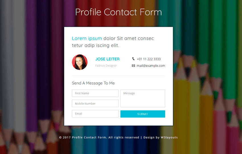 El formulario de contacto de perfil es un formulario de contacto moderno y elegantemente diseñado, una opción perfecta para todos sus sitios web, que agrega un bonito y hermoso aspecto a tu sitio web. Este moderno y creativo formulario de contacto se puede utilizar en tu página de contacto o sección de contacto en tu sitio web. Este precioso formulario de contacto tiene un atractivo fondo de imagen con el contenido de la forma principal diseñado en un fondo blanco plano junto con la imagen del usuario y su información de contacto.
