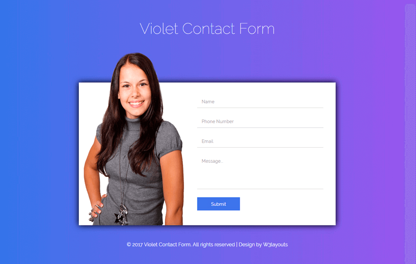 Este formulario de contacto Violeta es un formulario de contacto moderno y diseñado de forma única que se puede utilizar en todos los tipos de sitios web y que, con el tiempo, brindaría un atractivo y atractivo aspecto para tu sitio web. Este formulario de contacto elegantemente diseñado tiene un fondo violeta plano elegante y el contenido principal tiene una chica atractiva y elegante a la izquierda con contenido de formulario de contacto a la derecha diseñado sobre fondo blanco plano. Este formulario de contacto ha sido diseñado de forma fabulosa, es un formulario de contacto 100% responsive, compatible con todos los dispositivos y se muestra en todos los tamaños de pantalla. Está completamente construido en HTML5 y CSS3.